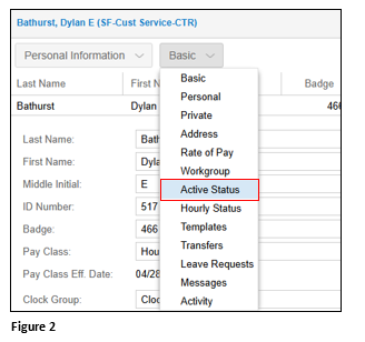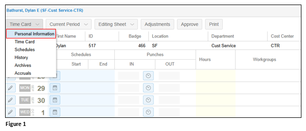 2.. From the employee timecard, click on the timecard drop-down menu and select Personal Information (Figure 1).