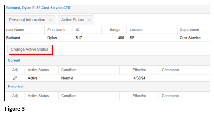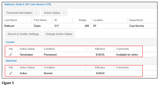 6. The employee’s Status has now been moved to Terminated. The historical changes will show at the bottom of the panel (Figure 5).