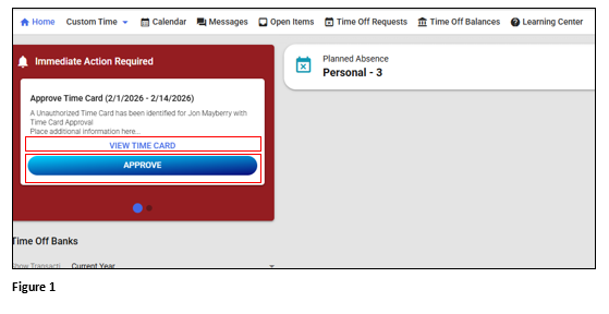 2. On the Home page, there will be a note titled Immediate Action Required. Click either View Time Card or Approve. It’s good practice to review the timecard prior to the approval but it is not required (Figure 1).